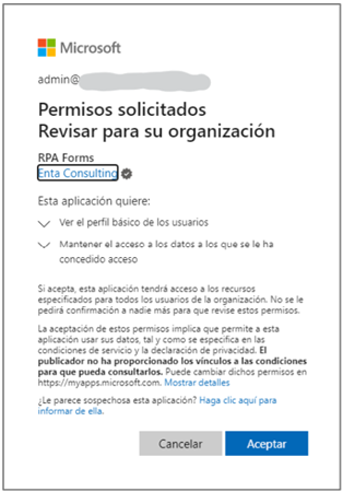 <figure><img src="https://3060159606-files.gitbook.io/~/files/v0/b/gitbook-x-prod.appspot.com/o/spaces%2FIHDzQLkoRvMElzdvWRuW%2Fuploads%2Fgit-blob-058e79e9ccb36d4a1007f686b9f9267b0a59cd9e%2Frpa_entra_id_1.png?alt=media" alt=""><figcaption><p>Aceptación de permisos</p></figcaption></figure>
