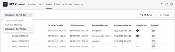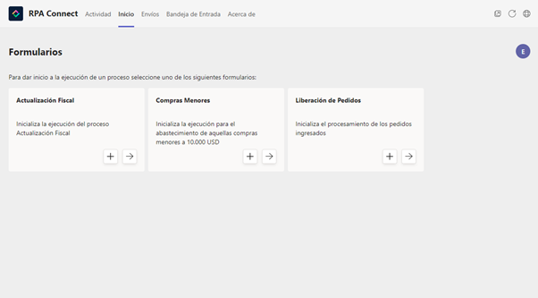 En la pestaña de ***Inicio*** de Teams podrás ver el listado de formularios que te hayan sido asignados en los roles de ***Contributor*** o ***Manager*** a través de la [configuración de ***Authorization Profiles***](https://docs.rpaconnect.io/administracion/admin-app/roles-y-permisos). Esta primera visualización será la misma para ambos tipos de roles pero, como vimos anteriormente, al momento de gestionar los envíos, los perfiles con permisos de ***Manager*** podrán visualizar también las instancias enviadas por otros usuarios con acceso a la plantilla.