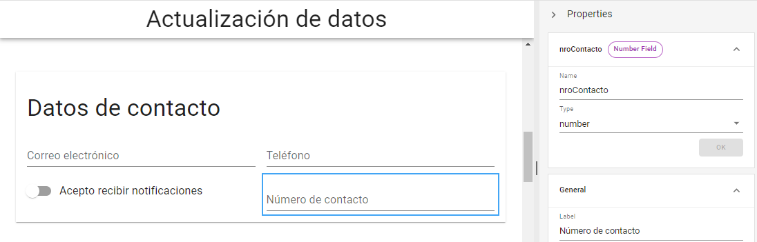 Veamos un ejemplo de este tipo de expresiones utilizando el campo "Teléfono" del formulario que has creado anteriormente. Añade un nuevo elemento de tipo ***Number*** con el ***label*** "Número de contacto" y el nombre "nroContacto".