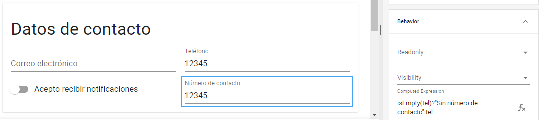 Es posible establecer configuraciones más precisas aplicando expresiones de validación a estas funciones. Por ejemplo, podemos utilizar la expresión ***isEmpty()*** y los operadores ternarios que vimos anteriormente para establecer distintos valores para "Número de contacto" según el campo "Teléfono" esté vacío o completo: