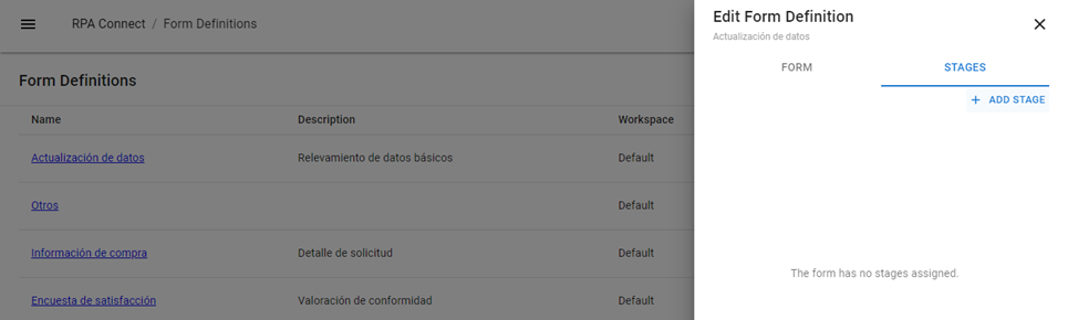 Se desplegará un apartado lateral con dos pestañas: ***Form***, la cual hemos visto anteriormente y corresponde a la información básica del formulario, y ***Stages***. Pulsa sobre esta última.
