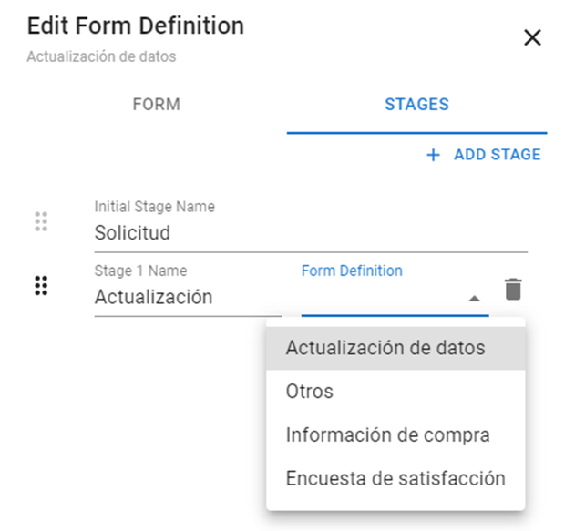 A continuación, haz clic sobre la opción ***Add stage*** para definir un nuevo paso. Modifica los nombres del ***Initial Stage*** (el punto de partida desde el cual el usuario recorrerá el workflow) y el ***Stage 1*** por los que desees y luego pulsa el desplegable para elegir el formulario correspondiente al primer paso (en este ejemplo, “Actualización de datos”).