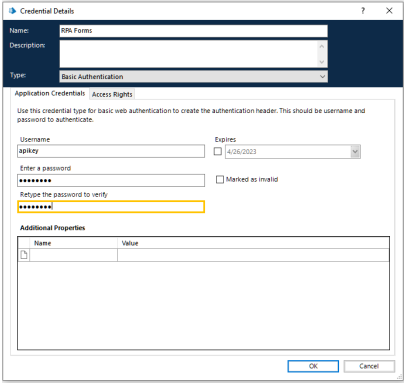 Next, access BluePrism and create a new authentication credential. Enter the desired name and select the type ***Basic Authentication***. Set the username as “apikey” and, for the key, use the ApiKey copied in the previous step.
