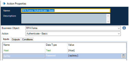 First of all, it is necessary to perform the authentication. As the ***host***, we will enter “<https://app.rpaconnect.io>” and as the ***apikey***, the ApiKey obtained during the credential creation process.