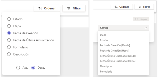 As in the ***Submissions*** screen, the buttons in the upper left corner allow you to sort and filter the forms based on their data, with the ability to apply multiple filters simultaneously. The filters for the ***Inbox*** are predefined, and it is not possible to add new options using ***tags***.